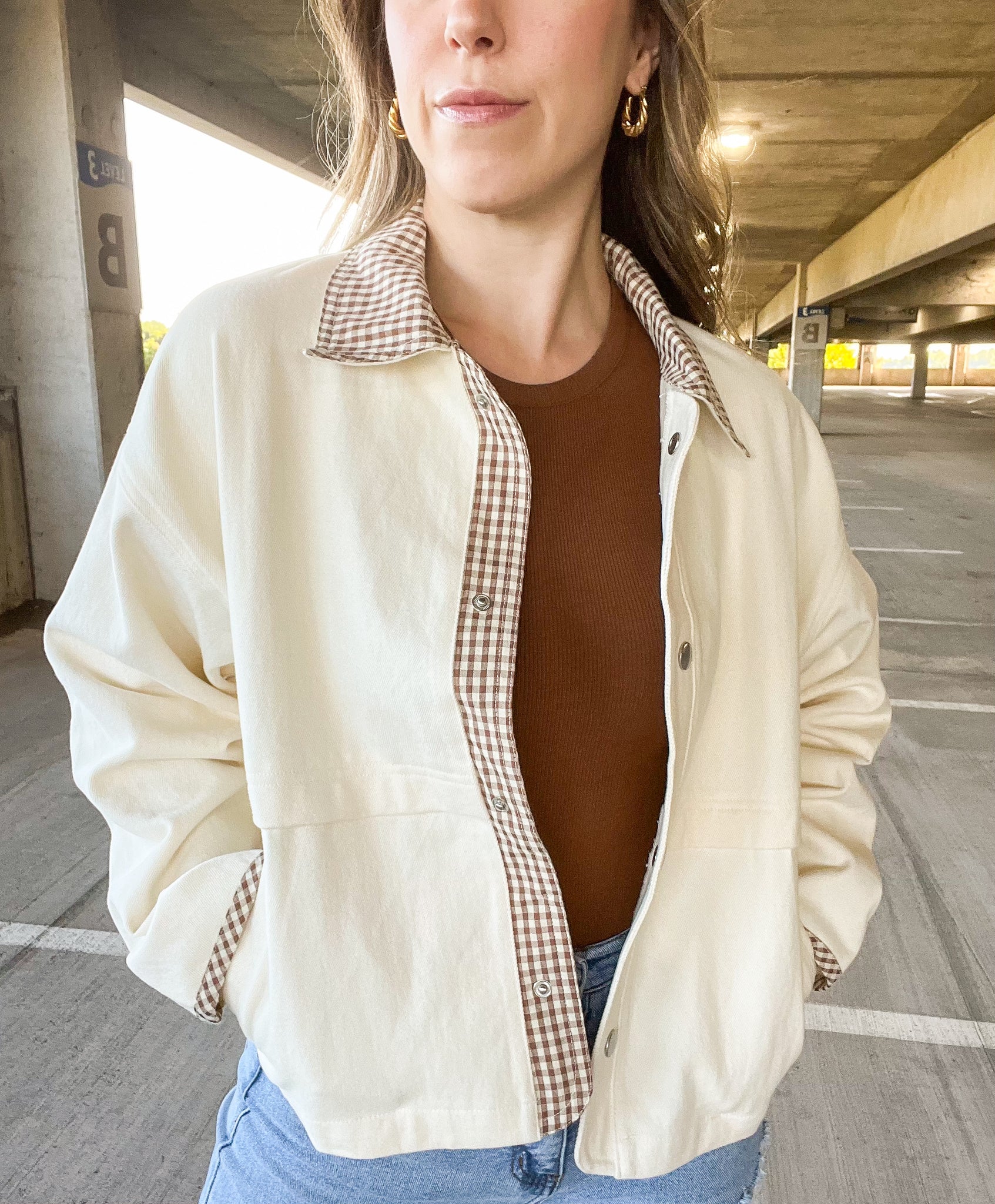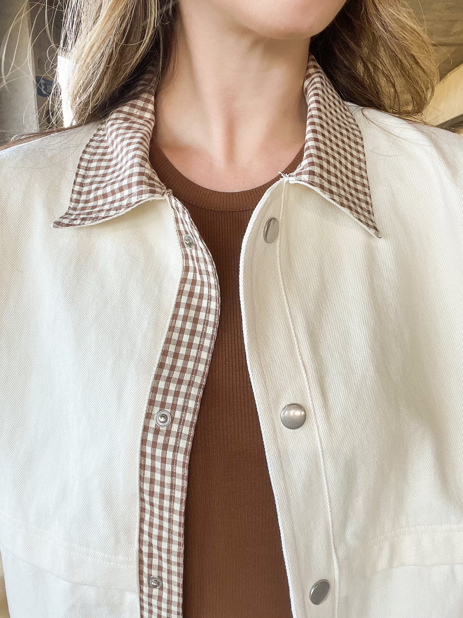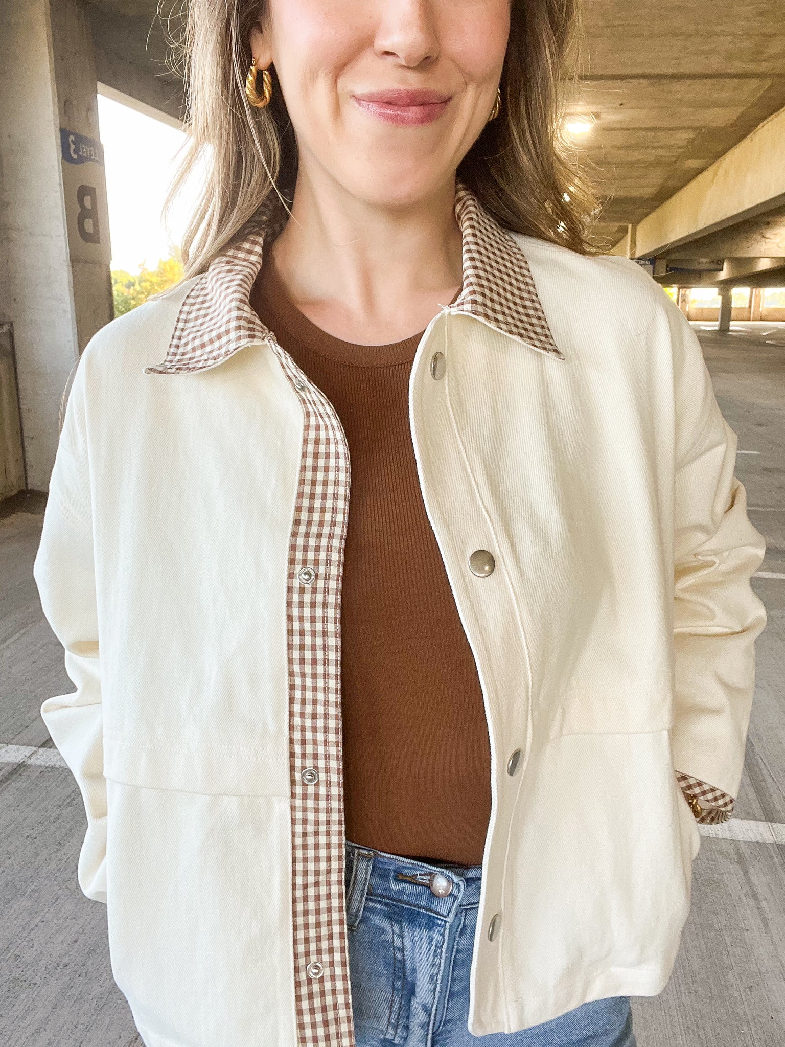 Spice up the day with the Grateful Heart Oversized Collared Cream Jacket With Brown Gingham Trim Detailing! This relaxed, wide cuff jacket has a collared neckline, with gingham pattern trim down the side and around the cuff of the sleeves. Also, the eye-catching stitching that shows an overlap of fabric across the middle gives it its unique look.